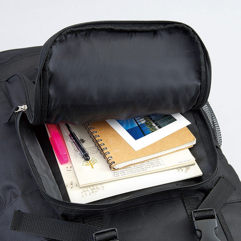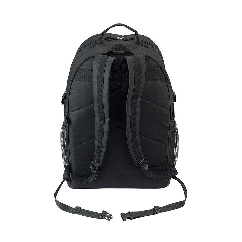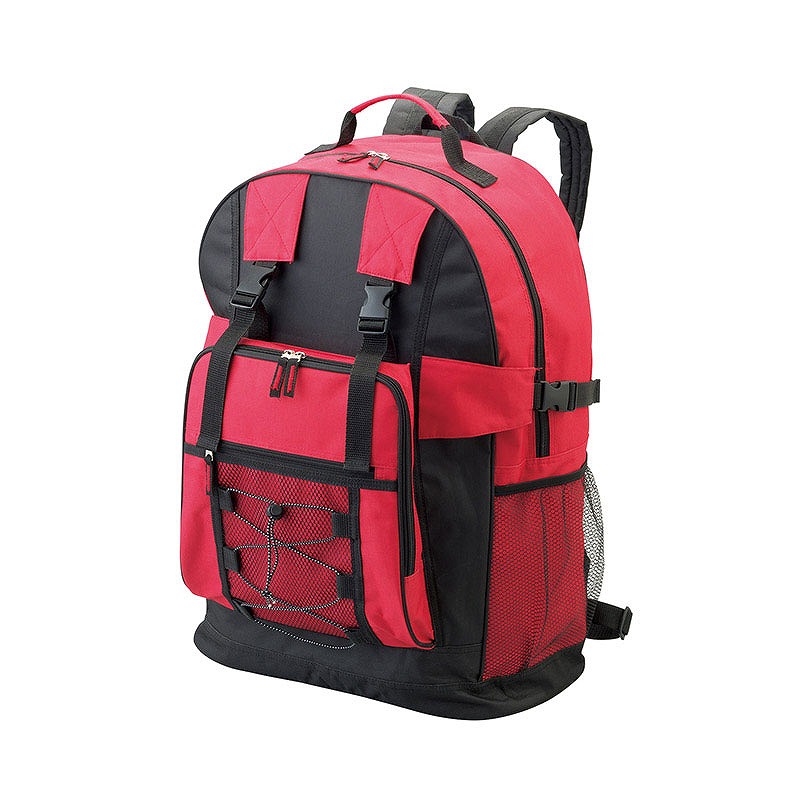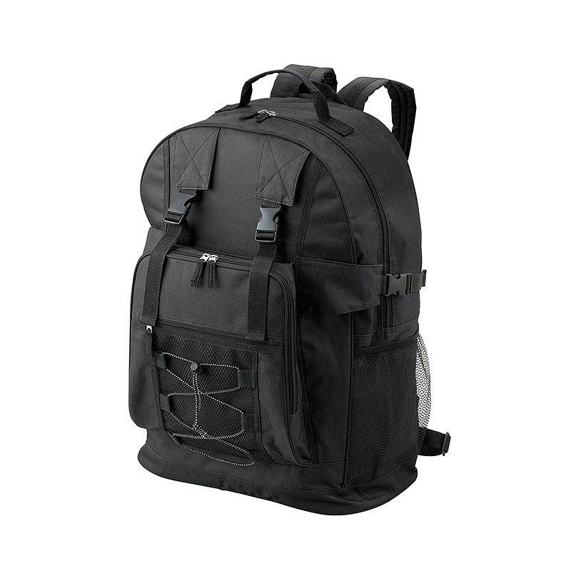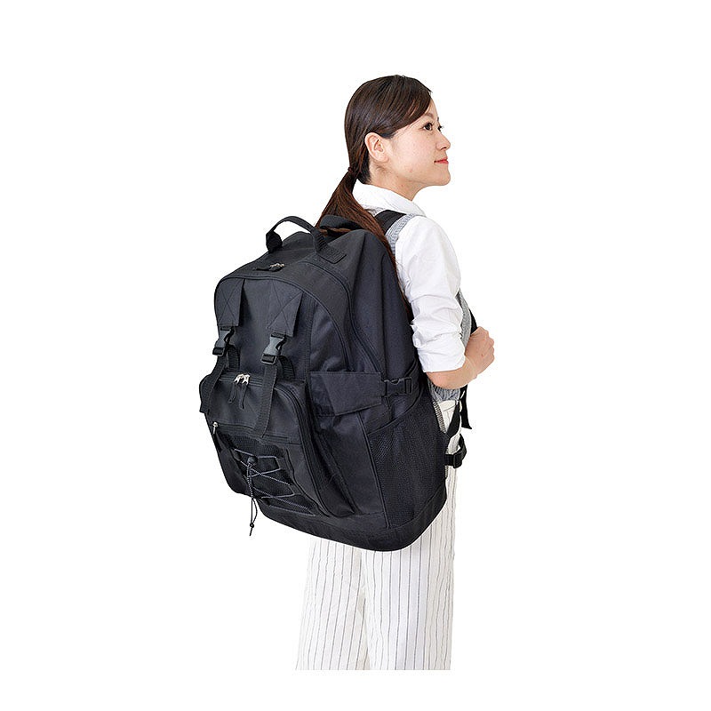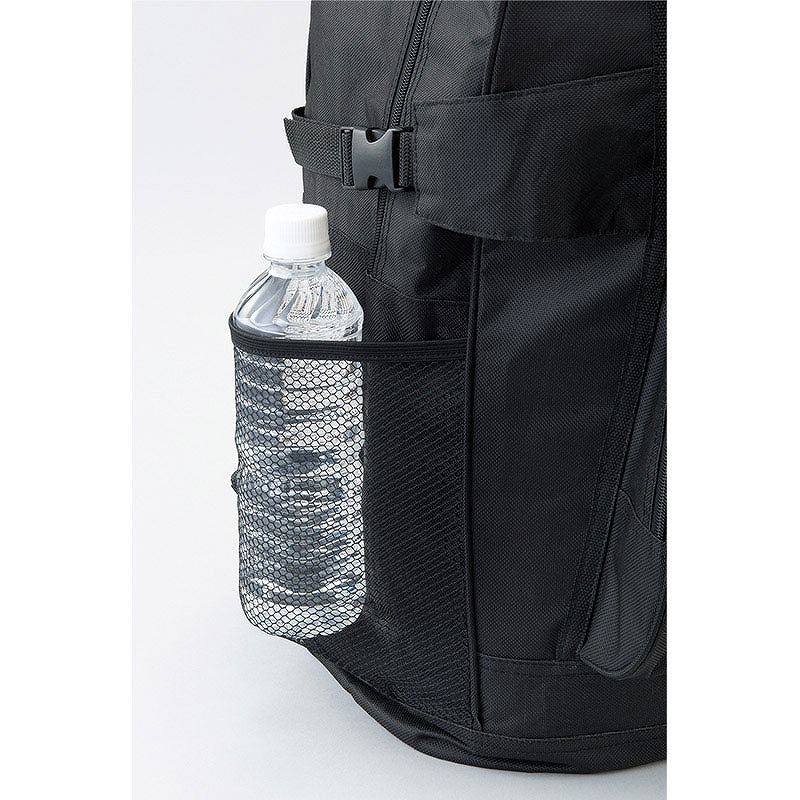 両ファスナー仕様(本体前面ポケットは片ファスナー)、前面のベルトに折り畳み傘などを固定できます・両サイドにポケットが付いているので、ペットボトルやレジャーシートなどの長尺物も収納できます。また、メッシュタイプなので中身が一目で分かります。ウエストベルト付きなので激しく動く際もバッグが体にフィットします。