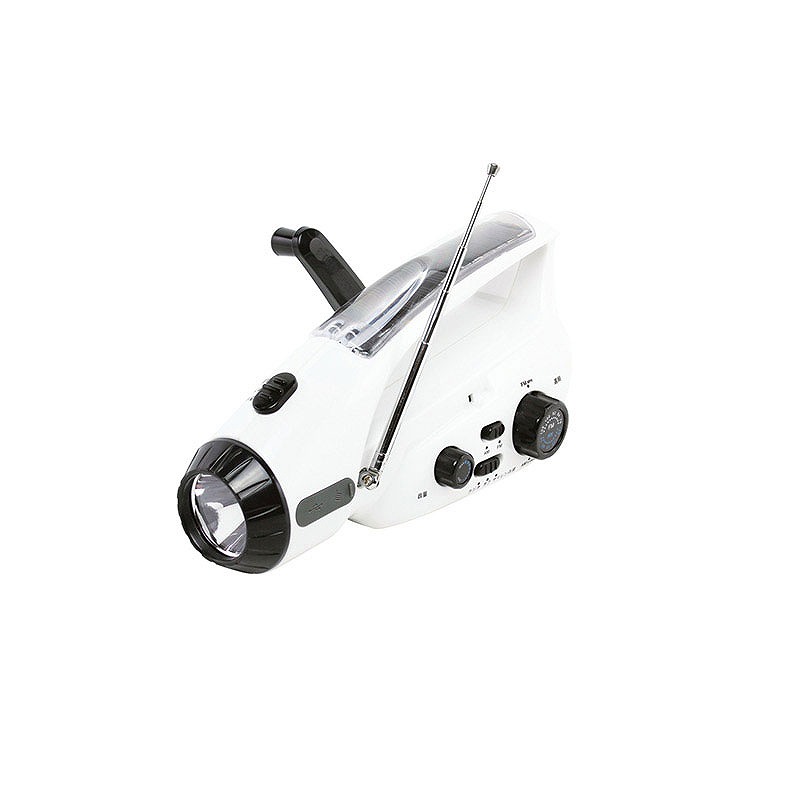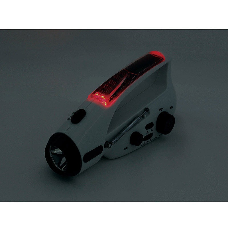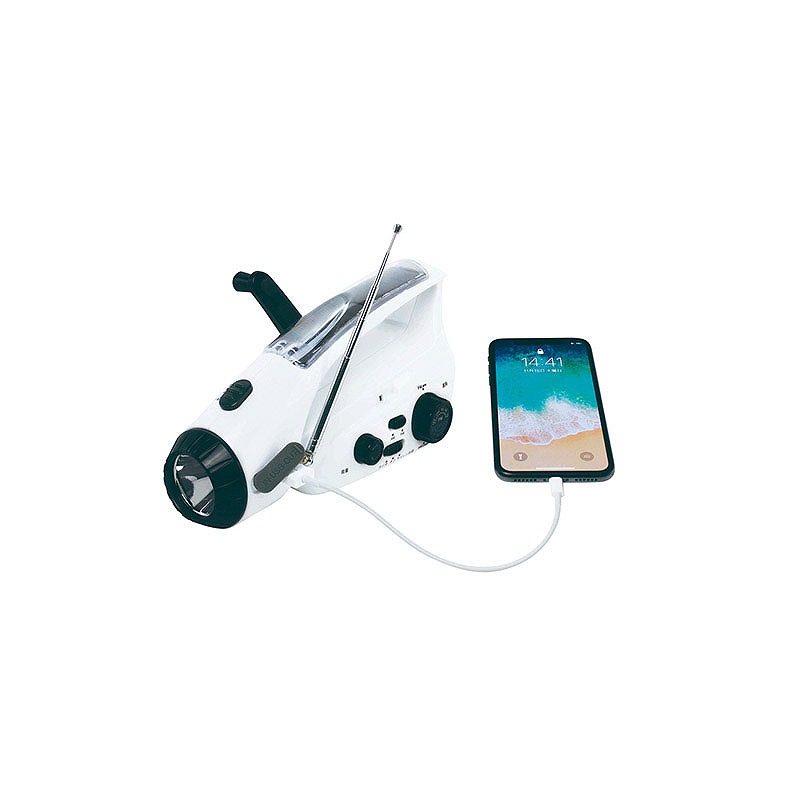 ソーラー充電&手回し充電で乾電池不要。USBポートからスマホ充電可能(2000mAhバッテリー内蔵)。AM/FMラジオ・LEDライト・サイレン、LED点滅といった機能を持っているため、いざという時に手元にあると安心できます。軽量なので防災バックに備えておきたい製品の1つとしてお勧めいたします。