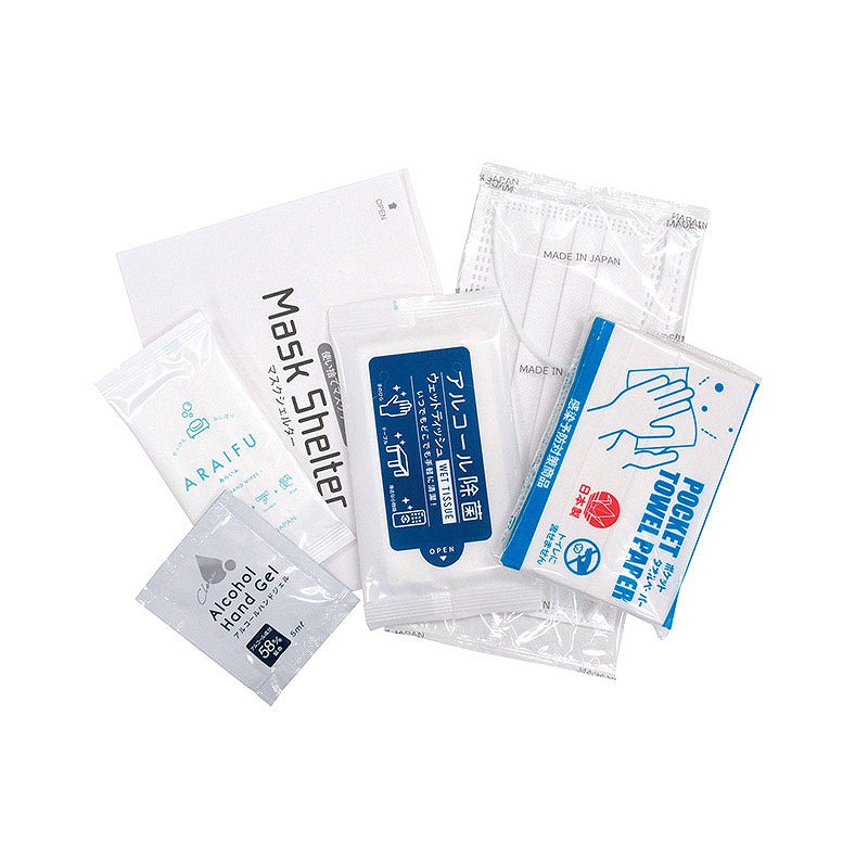 セット内容:(1)マスク、(2)マスクシェルター、(3)除菌ウエットティッシュ、(4)石鹸おしぼり、(5)除菌ジェル5ml、(6)ポケットタオルペーパー