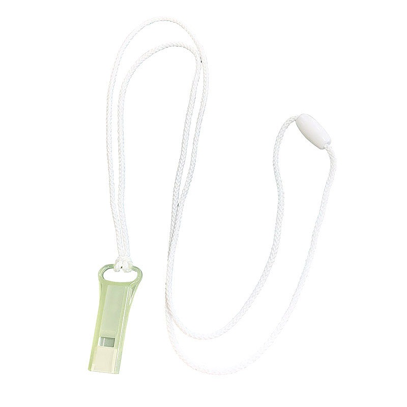 薄くても小型ながらも、人間の一番聞こえやすい約3000Hz付近の音を出せ音量も約95dBでます。暗がりでも光る錆びないオール樹脂製のホイッスル。肌触りの良いエステル製紐には約2.5kgの力が加わると外れる安全パーツが付いております。