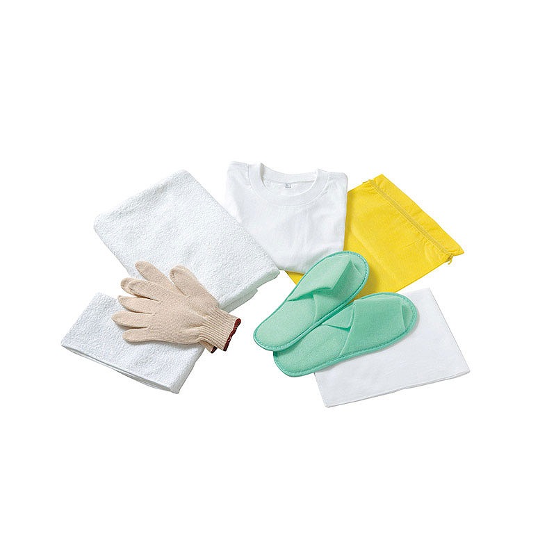 バスタオル:綿 Tシャツ:綿 タオル:綿 さらし:綿 軍手:綿 スリッパ:ポリエステル、ポリウレタン、EVA樹脂 他 巾着袋:ポリプロピレン不織布