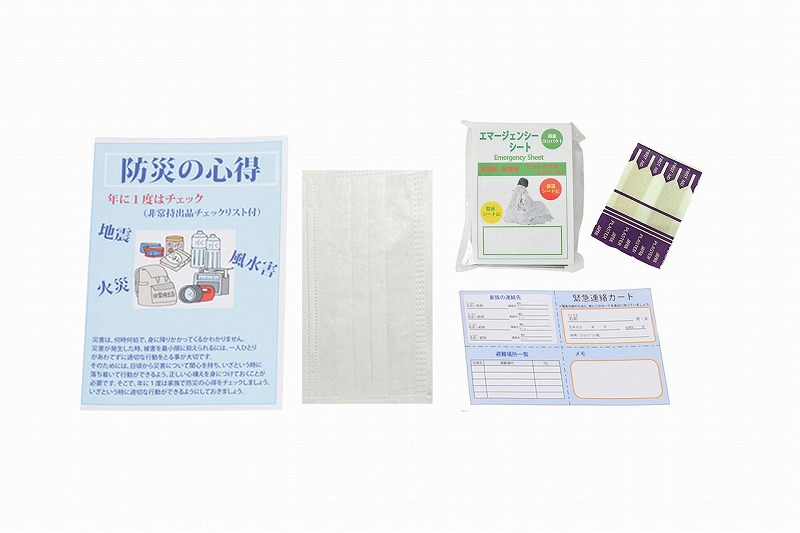 防災のしおり、IDカード、エマージェンシーシート、マスク、絆創膏2毎