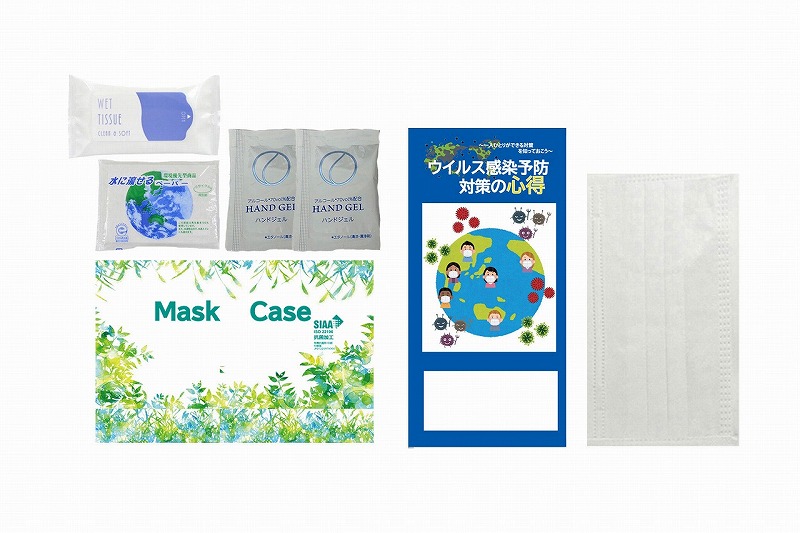 ウイルス感染予防のしおり、抗菌マスクケース、日本製マスク、アルコールハンドジェル2個、ポケットティッシュ、ウェットティッシュ