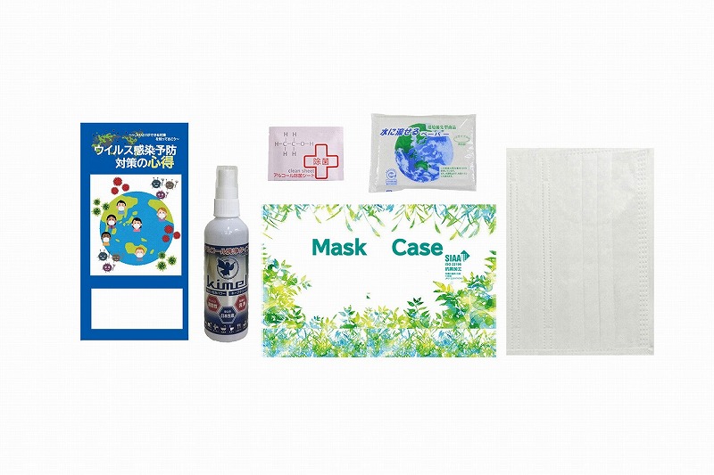 ウイルス感染予防のしおり、抗菌マスクケース、日本製マスク2枚、アルコールスプレー100ml、水に流せるポケットティッシュ、アルコール除菌シート