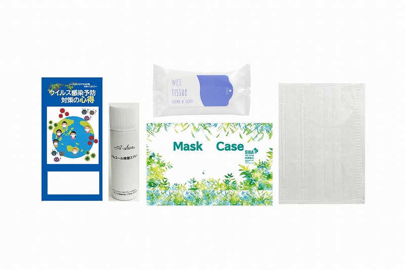 ウイルス感染予防のしおり、抗菌マスクケース、日本製マスク2枚、アルコール除菌スプレーA、ウェットティッシュ
