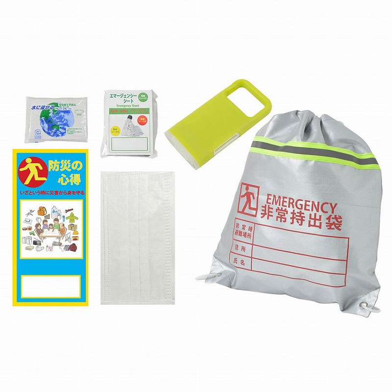 携帯用非常袋、エマージェンシーシート、マスク、防災のしおり、ポケットティッシュ、マスク