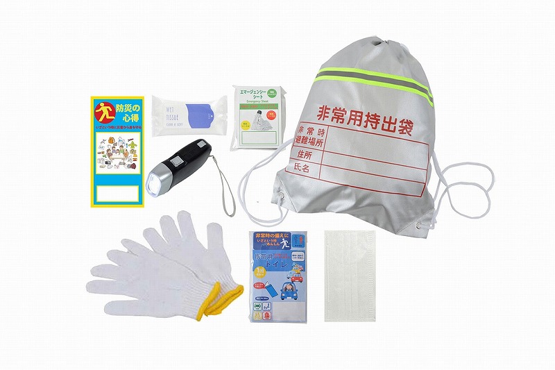 非常持出袋、エマージェンシーシート、ダイナモライト、防災のしおり、マスク、軍手、ウェットティッシュ、携帯トイレ、