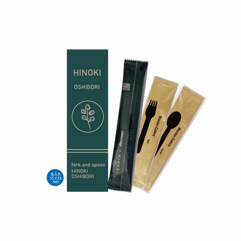 ひのきおしぼり2P、紙完封使い捨て木製スプーン・フォーク・デザートスプーン 各1本