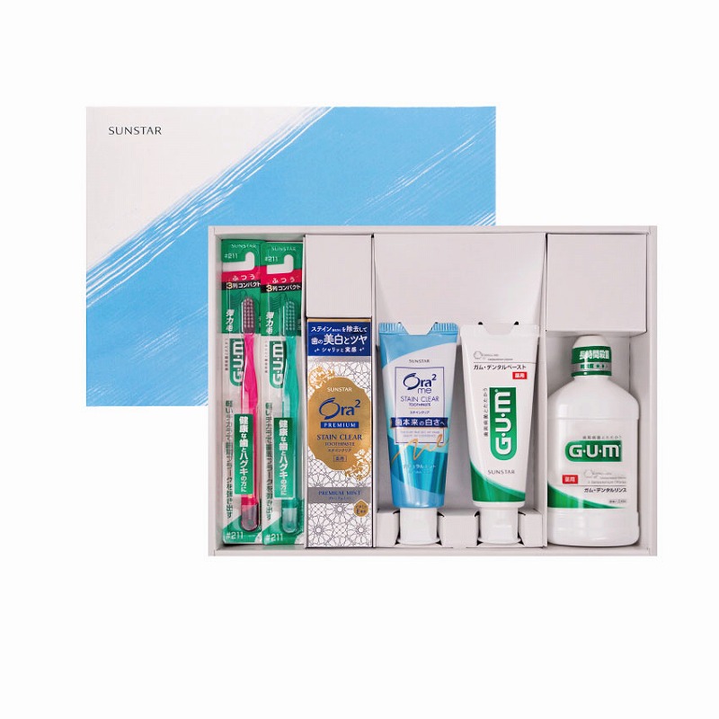 ガムデンタルペーストスタンディングタイプ120g、オーラツーミーステインクリアペーストナチュラルミント130g、オーラツーステインクリアペーストプレミアム100g、ガムデンタルリンスレギュラータイプ250ml×各1、ガムデンタルハブラシ”211ふつう×2