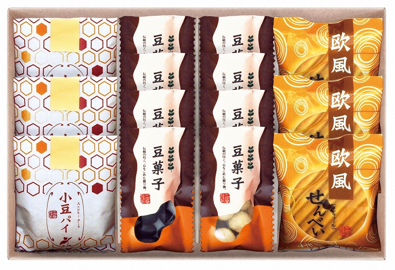 おもてなしにぴったりな、ほっこり和むお菓子の詰合せ。和の味わいをお楽しみください。 欧風せんべい さっくりと焼き上げた歯ごたえのよい生地に、やさしく香るバニラクリームを挟みこんだ欧風せんべいです。 小豆パイ パイ生地で餡を包み、しっとりと焼き上げたお菓子です。 豆菓子 竹炭 一度食べるとくせになる、ピリッと甘辛醤油味の豆菓子です。 きなこ 落花生にきなこをたっぷり巻き込み、仕上げた豆菓子です。