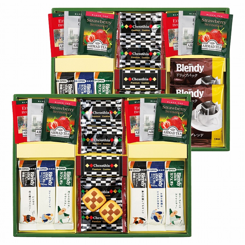 チェスティアクッキー×12・AGFブレンディコーヒー(ドリップ式)7g×2・紅茶(アールグレイ・ブレックファースト・ストロベリー)2g×各4・AGFブレンディスティック(エスプレッソオレ6.2g・カフェオレカロリーハーフ5.4g・カフェオレ8.8g)各3 [卵・乳成分・小麦]