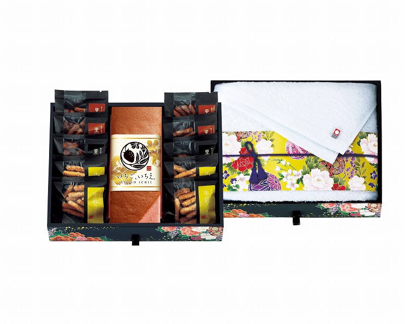 和三盆糖入かすてぃら(いちご)1本・かりんとう(黒糖×4・黒胡麻×2・牛乳×4)各15g・フェイスタオル340×750mm [卵・乳成分・小麦]