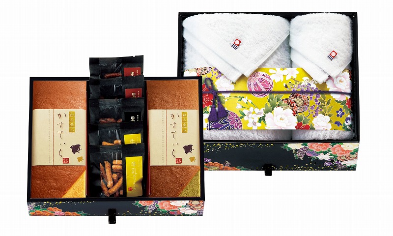 和三盆糖入かすてぃら(プレーン・抹茶)各1本・かりんとう(黒糖×2・黒胡麻×1・牛乳×2)各15g・フェイスタオル340×750mm・バスタオル600×1200mm [卵・乳成分・小麦]
