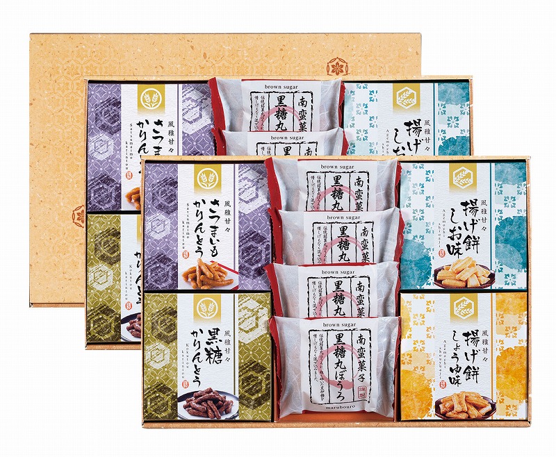銘菓丸ぼうろに、粗く砕いた黒砂糖を練り込んだ黒糖丸ぼうろと国産玄米から作られた米油100%で揚げたかりんとう、国産のもち米を使用し、米油とごま油をブレンドした油で揚げサクッとした食感の揚げ餅の詰合せです。