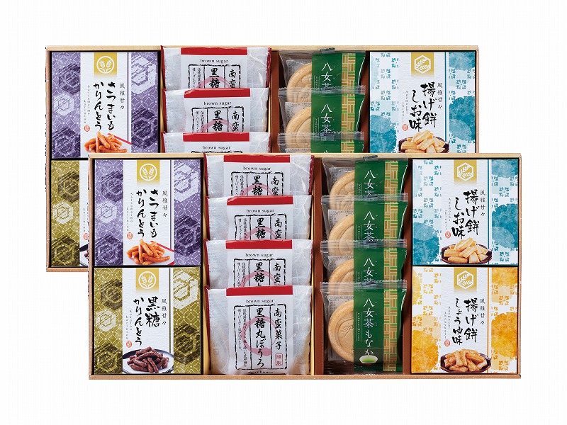 黒糖丸ぼうろ×8・揚げ餅(しお味・しょうゆ味)20g×各2・かりんとう(さつまいも・黒糖)30g×各2・もなか(八女茶)×8 [卵・小麦]