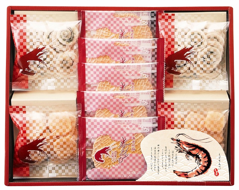 赤えびを使用し焼き上げた、ヘルシー志向のノンフライ製法のおせんべい。二度焼き製法で優しい食感に作ったうず巻き・えび松風。えびせんべいの原料として最適な海老を使用しこだわりの製法で仕上げました。 二度焼き製法でサクッと軽い食感「えび松風」。 軽くて優しい食感、海苔がアクセントの「うず巻」。 赤えびを使用し焼き上げた、ヘルシー志向のノンフライ製法「赤えびせん」。