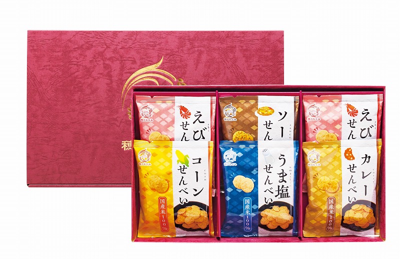 あおさ海苔を生地に練り込み、磯の香り、ソースの旨みを堪能できるソースせんべい。 スイートコーンの甘さが引き立つ、香ばし醤油仕立てのコーンせんべい。 カリッと口いっぱいに広がる香ばしいえびの風味で後引く旨さのえびせんべい。 お米と相性の良いスパイシーなカレー風味のカレーせんべい。 カリッとシンプルな美味しさでお米を味わうあっさりうま塩せんべい。