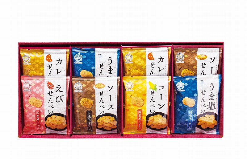 あおさ海苔を生地に練り込み、磯の香り、ソースの旨みを堪能できるソースせんべい。 スイートコーンの甘さが引き立つ、香ばし醤油仕立てのコーンせんべい。 カリッと口いっぱいに広がる香ばしいえびの風味で後引く旨さのえびせんべい。 お米と相性の良いスパイシーなカレー風味のカレーせんべい。 カリッとシンプルな美味しさでお米を味わうあっさりうま塩せんべい。