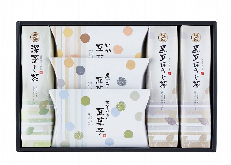 静岡産深蒸し茶ティーバッグ(2.5g×7)・黒豆ほうじ茶ティーバッグ(2.5g×7)×2・豆菓子(いか味32g・黒ごま味45g・抹茶ミルク味35g) [卵・乳成分・小麦・落花生]