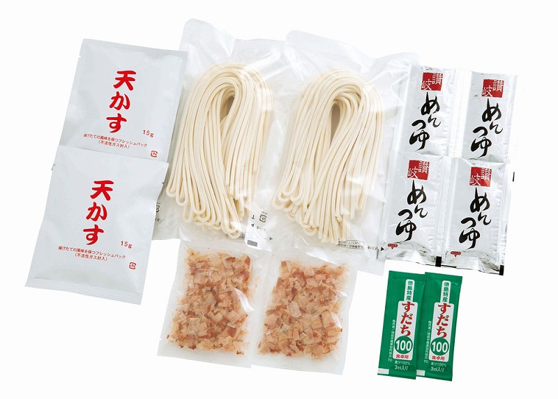 [セット内容] 半生讃岐うどん包丁切り220g×2 めんつゆ20ml×4 天かす15g×2 すだち果汁3ml×2 かつお節2g×2