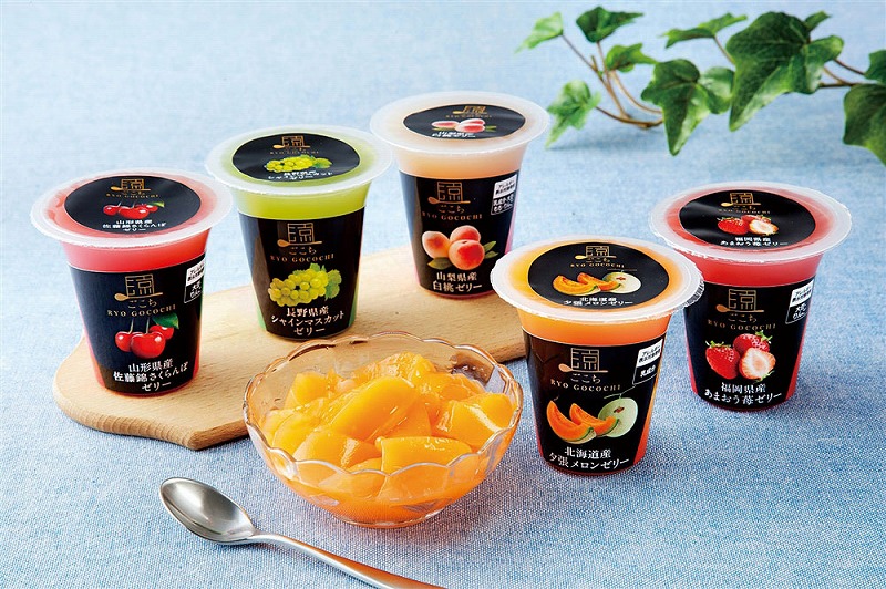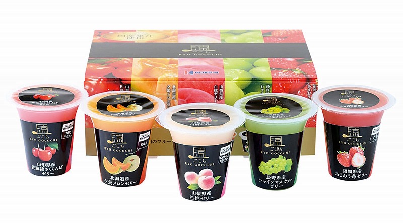 北海道夕張メロン、長野県産シャインマスカット、山梨県産白桃、福岡県産あまおう苺、山形県産佐藤錦さくらんぼの果汁を使用した、ジューシーで香り高いゼリーに仕上げています。