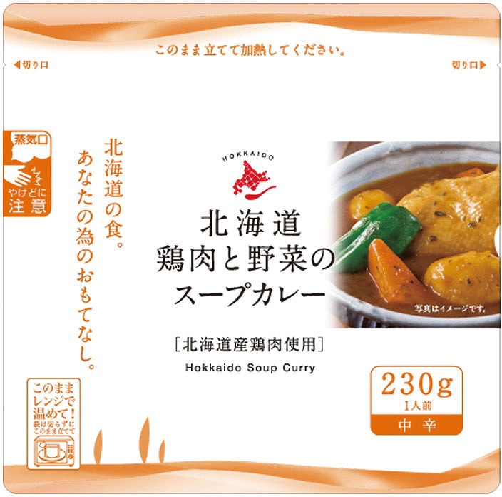 北海道素材をぎゅっとレトルトパウチに閉じ込めました。レンジに袋のまま入れて温めるだけ。北海道産の鶏肉使用。数種類のスパイスをブレンドしたコクのある本格スープカレーです。