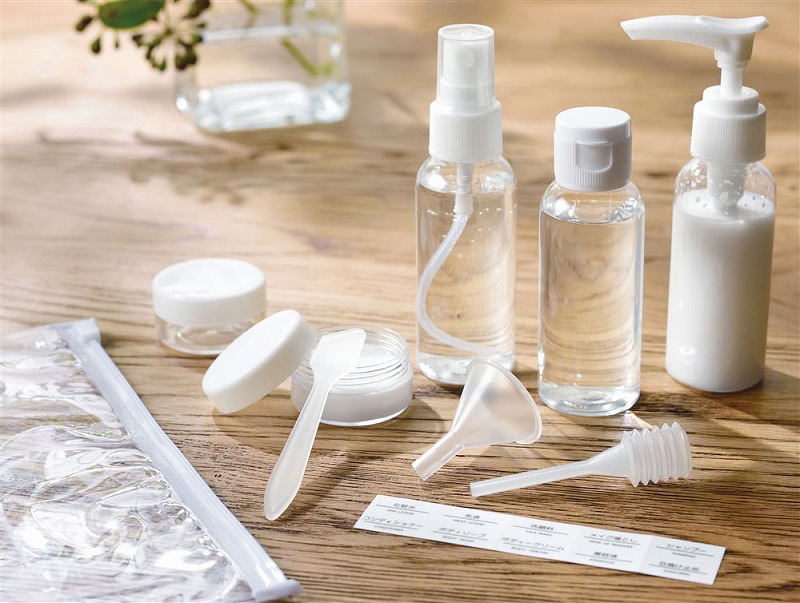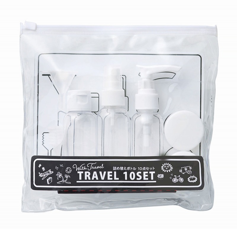 収納ポーチ/PVC・ポリプロピレン プッシュポンプボトル・スプレーボトル・ワンタッチキャップボトル/ボディ:PET ヘッド:ポリプロピレン・ポリエチレン クリームケース/ボディ:ポリスチレン フタ:ポリプロピレン じょうご/ポリプロピレン スポイト/ポリエチレン ヘラ/ポリプロピレン