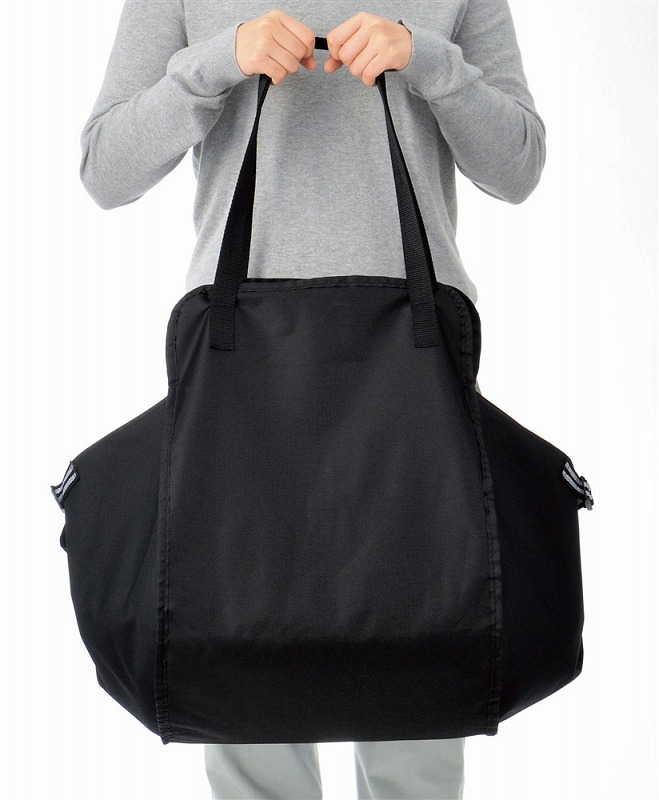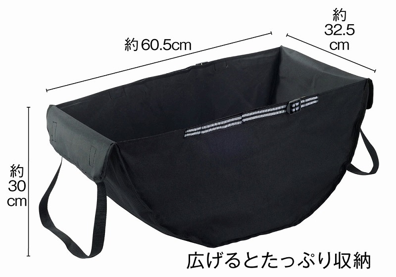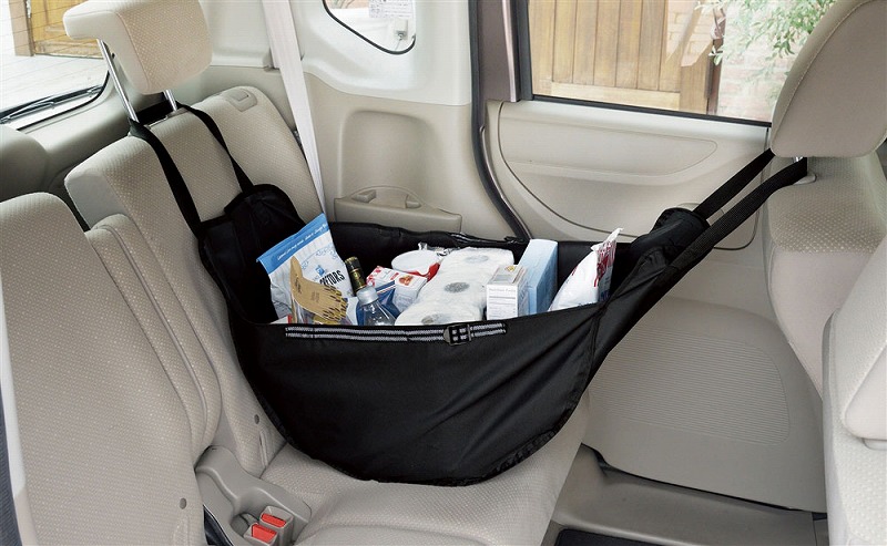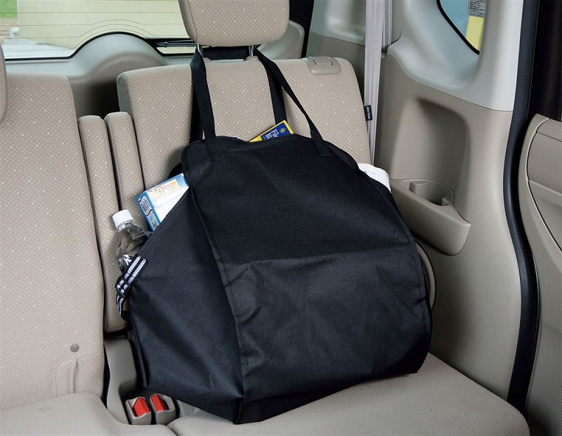 車の後部座席に置き、取っ手を前後の座席のヘッドレストにひっかけて使用します。走行中のレジ袋などの崩れ落ちの心配もありません。
