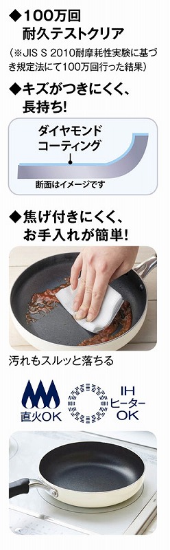 本体/アルミニウム合金 表面塗装/ふっ素樹脂塗膜加工(ダイヤモンド微粒子配合) はり底/ステンレス鋼 取っ手/フェノール樹脂