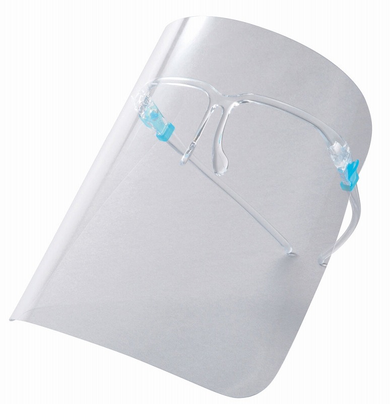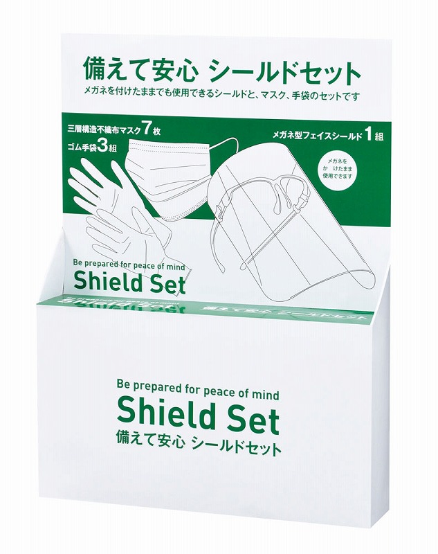 フェイスシールド/ポリカーボネート・熱可塑性エラストマー・A-PET 三層構造不織布マスク/本体:ポリプロピレン 耳部:ポリエステル・ポリウレタン ノーズフィッター/ポリエチレン(芯材) ゴム手袋/天然ゴム