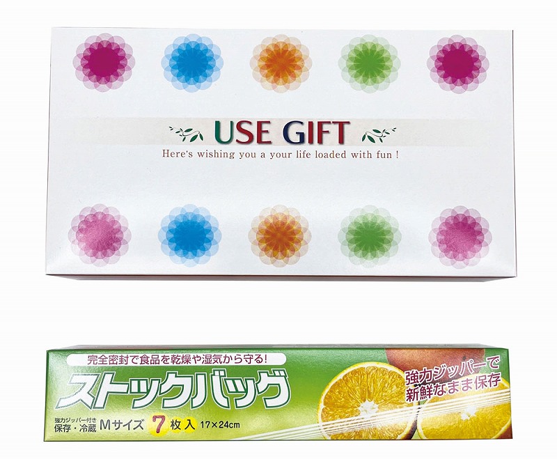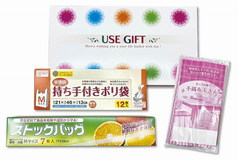 不織布ふきん3枚、ストックバッグM7枚、持ち手付きポリ袋Mサイズ12枚(レジ袋タイプ)のセット品です。 日常生活で使う商品ばかりなのでもらった人もうれしい3点セットです。