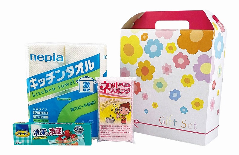 スポンジ・台所用洗剤・ラップ・アルミホイルなどのギフトセットをまとめたカテゴリです。500円以下の販促品・景品向け、1000円以上の記念品向け、2000円以上のギフト向けなどご用意しております。