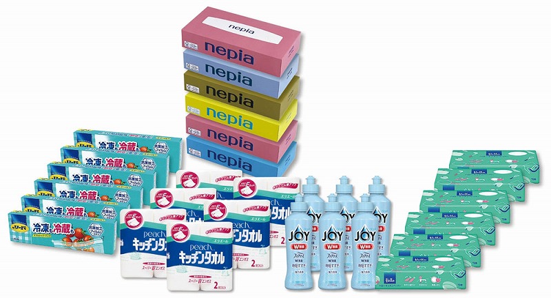 [セット内容] ・P&G除菌ジョイコンパクト170ml(フレッシュクリーン)×6 ・ライオンリード冷凍も冷蔵も新鮮保存バッグS3枚×6 ・エリエールピーチキッチンタオル2ロール(50カット)×6 ・ネピアボックスティシュ150W×6 ・ハローキッチンペーパー70枚×6 ※ネピアボックスティシュは5色不均等アソートになります。