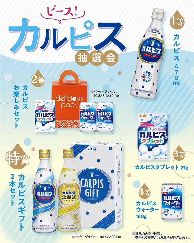 [キット内容] [特賞]カルピスギフト2本セット・・・1本 [1等]カルピス470ml ・・・2本 [2等]カルピスお楽しみセット・・・3本 [3等]カルピスタブレット27g・・・14本 [4等]カルピスウォーター160g・・・30本 [付属] 抽選くじ×50枚、くじ明細書×1枚、抽選箱×1個、告知用A4カード×1枚 ※賞品の内容・デザインは画像と異なる場合があります。あらかじめご了承ください。