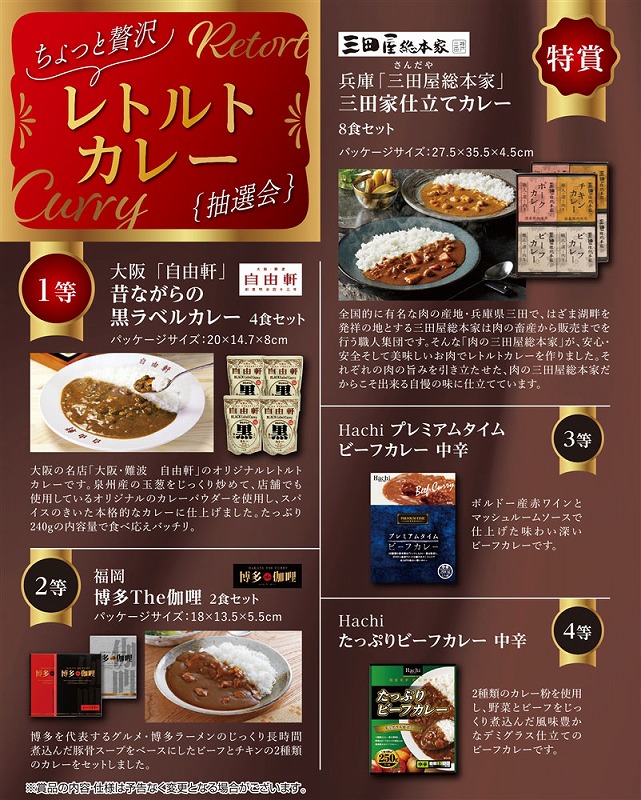 365日(残日数120日以上) [特賞]兵庫 「三田屋総本家」 三田屋仕立てカレー 8食セット・・・720日間(常温) [1等]大阪 「自由軒」 昔ながらの黒ラベルカレー 4食セット・・・730日間(常温) [2等]福岡 博多The伽哩 2食セット・・・365日間(常温) [3等]Hachi プレミアムタイム ビーフカレー(中辛)・・・720日間(常温) [4等]Hachi たっぷりビーフカレー (中辛)・・・720日間(常温)