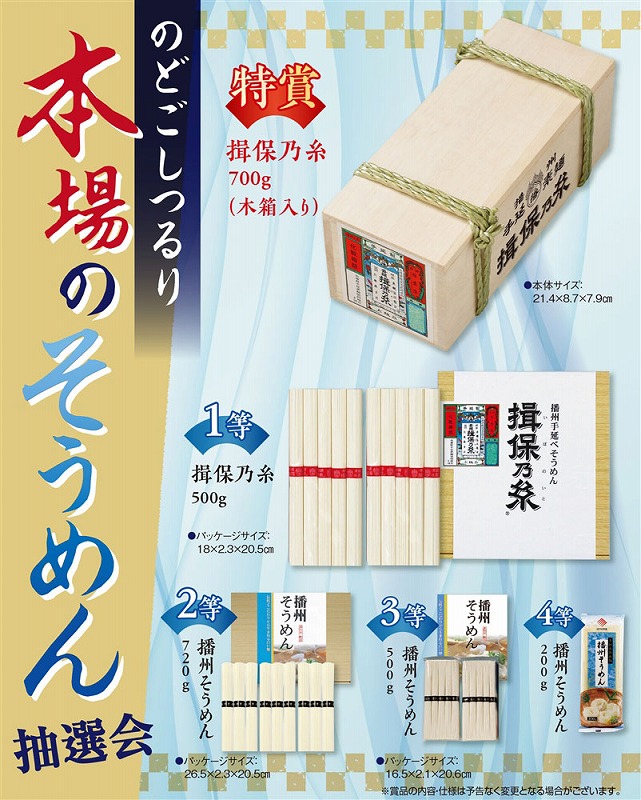 [キット内容] [特賞]揖保乃糸 赤帯上級品700g(木箱入り)・・・1本 [1等]揖保乃糸 赤帯上級品500g ・・・2本 [2等]播州そうめん720g・・・4本 [3等]播州そうめん480g・・・8本 [4等]播州そうめん200g・・・85本 [付属] 抽選くじ×100、くじ明細書×1、抽選箱×1、告知用A4カード×1 ※賞品の内容・デザインは画像と異なる場合があります。あらかじめご了承ください。