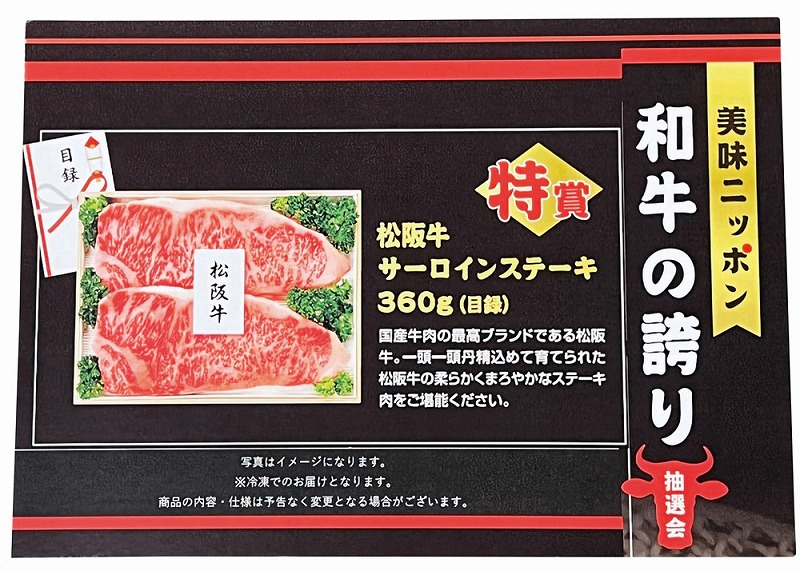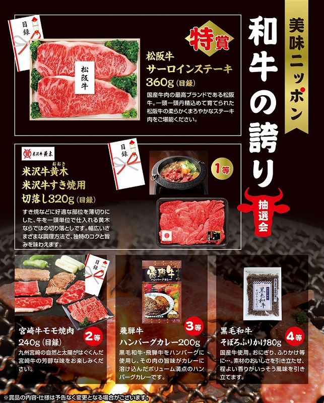[キット内容] [特賞]松阪牛サーロインステーキ360g(目録)・・・1本 [1等]米沢牛黄木 米沢牛すき焼用切落し320g(目録)・・・1本 [2等]宮崎牛モモ焼肉240g(目録)・・・1本 [3等]飛騨牛ハンバーグカレー200g・・・7本 [4等]黒毛和牛そぼろふりかけ80g・・・20本 [付属] 抽選くじ×30、抽選箱×1、くじ明細書×1、告知用A4カード×1 ※賞品の内容・デザインは画像と異なる場合があります。あらかじめご了承ください。