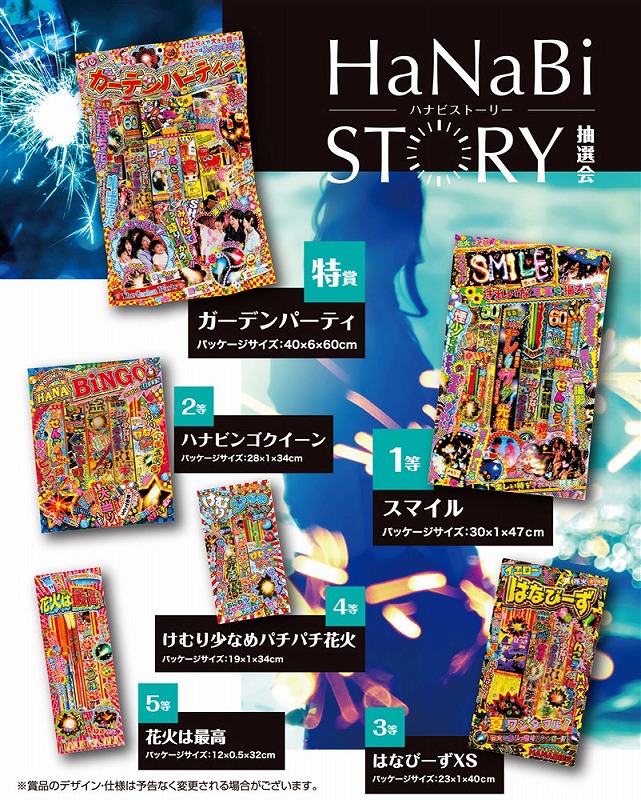 [キット内容] [特賞]ガーデンパーティ・・・1本 [1等]スマイル・・・2本 [2等]ハナビンゴクイーン・・・3本 [3等]はなびーずXS・・・4本 [4等]けむり少なめパチパチ花火・・・5本 [5等]花火は最高・・・35本 [付属] スクラッチくじ×50、くじ明細書×1、抽選箱×1、告知用A4カード×1