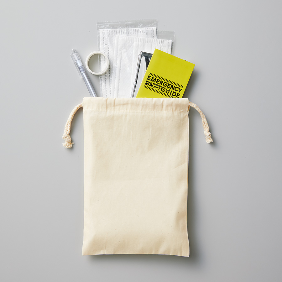 巾着/コットン、マスク/不織布(PP) 他、アルミブランケット/アルミ蒸着PET、防災ガイド/紙、マスキングテープ/紙、スカッシュボールペン/ABS、AS 他