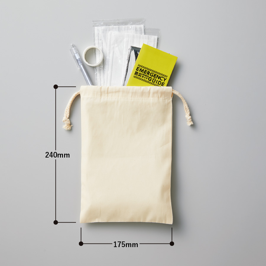 巾着/175×240(mm) マスク/約165×95(mm) アルミブランケット/約700×1400(mm) マスキングテープ/約15×2000(mm) スカッシュボールペン/約144(mm)防災ガイド/70×105(mm)(mm)