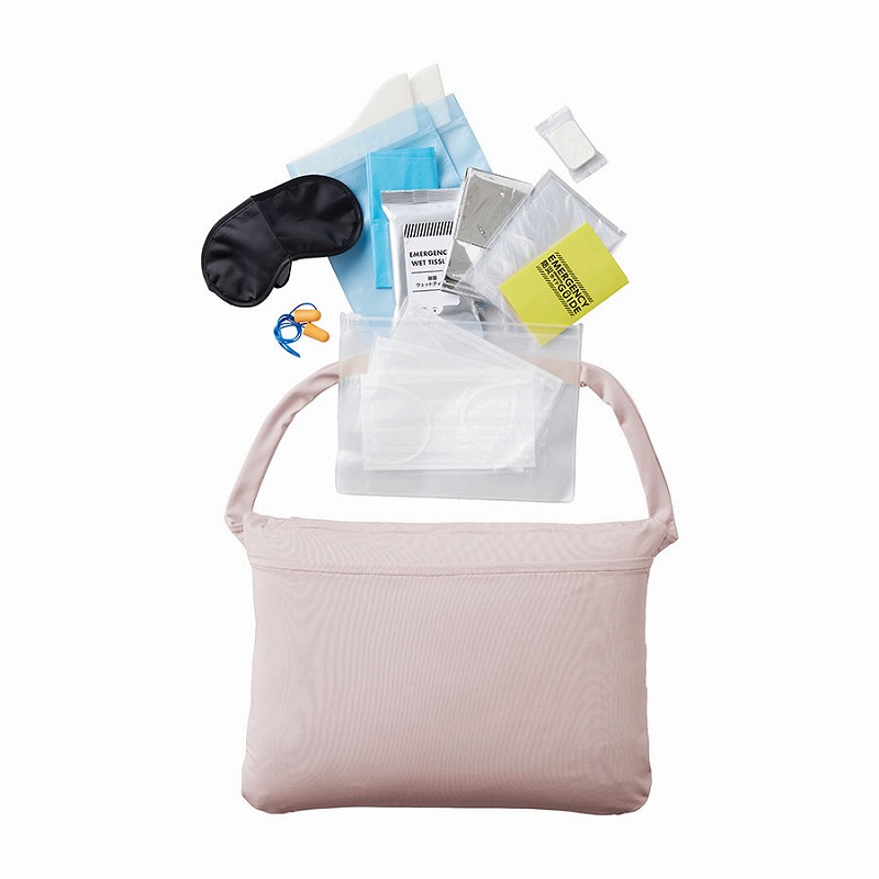 クッションカバー/ポリエステル、ポリウレタン・インナークッション/ポリエステル、ポリウレタン・ポーチ/EVA 他・携帯トイレ/不織布(PP)、IXPE、高吸水性樹脂・携帯トイレ付属ごみ袋/HDPE・アイマスク/ポリエステル・耳栓/EVA 他・ポリ袋/PE・ウェットティシュ/ポリエステル、レーヨン・アルミブランケット/アルミ蒸着PET・圧縮タオル/不織布・マスク/不織布(PP)・防災ガイド/紙
