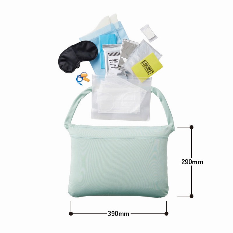 クッションカバー/390×290(mm)インナ-クッション/420×310(mm)ポーチ/230×170(mm)携帯トイレ/145×230(mm)携帯トイレ付属ごみ袋/252×450(mm)アイマスク/185×85(mm)耳栓/Φ12×680(mm)ポリ袋/80×270(mm)ウェットティッシュ/92×144(mm)アルミブランケット/1400×700(mm)圧縮タオル/広げた時:約240×300(mm)マスク/約165×95(mm)防災ガイド/70×105(mm)