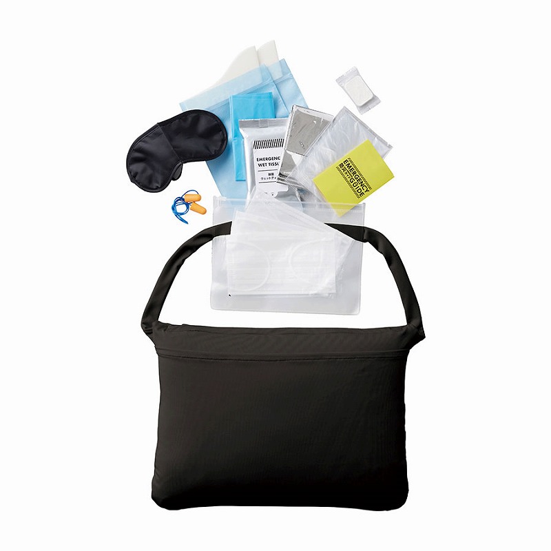 クッションカバー/ポリエステル、ポリウレタン・インナークッション/ポリエステル、ポリウレタン・ポーチ/EVA 他・携帯トイレ/不織布(PP)、IXPE、高吸水性樹脂・携帯トイレ付属ごみ袋/HDPE・アイマスク/ポリエステル・耳栓/EVA 他・ポリ袋/PE・ウェットティシュ/ポリエステル、レーヨン・アルミブランケット/アルミ蒸着PET・圧縮タオル/不織布・マスク/不織布(PP)・防災ガイド/紙