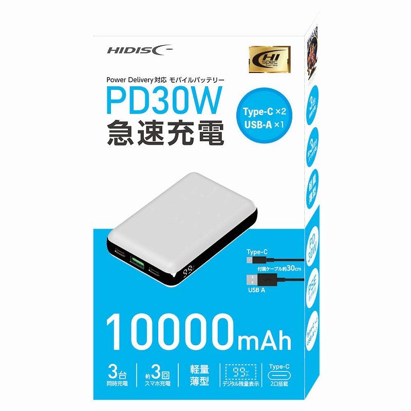 HIDISC モバイルバッテリー 10000mAh PD30W急速充電/Type-Cx2/USB-Ax1 ホワイト HD-PD30W10000FTWH