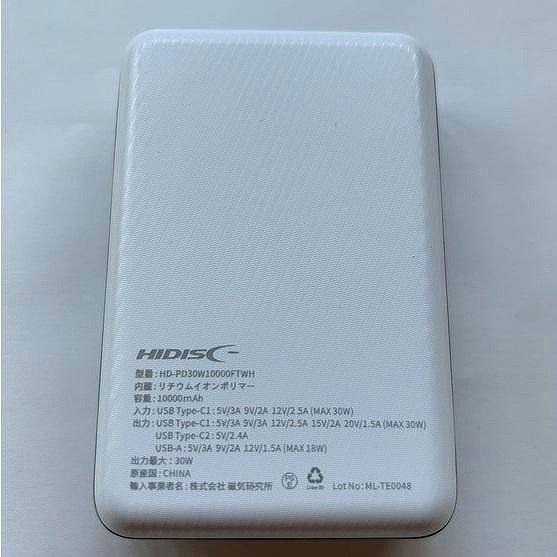 ”名入れ ロゴ入れ オリジナル” 『HIDISC モバイルバッテリー 10000mAh PD30W急速充電/Type-Cx2/USB-Ax1 ホワイト HD-PD30W10000FTWH』