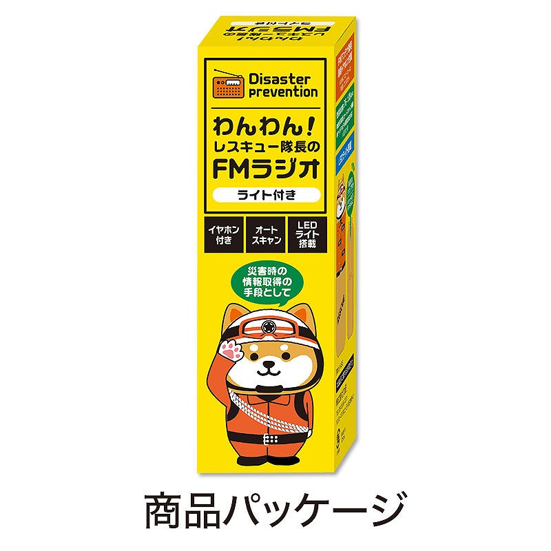スマホも、Wi-Fiも、その機能が失われる可能性が高い緊急災害時… その時活躍するのは「FMラジオ」です! ワイドFM対応なので、FM補完中継局の放送エリア内であれば、AM放送を聞くこともできます。 ワイドFMについて、詳しくは総務省解説ページをご確認ください。 ※https://www.soumu.go.jp/menu_seisaku/ictseisaku/housou_suishin/fm-seibi.html 災害時に嬉しい、ライト機能も付いています。 オートスキャン機能搭載で、局あわせもラクラク! イヤホンコード自体が「アンテナ」の役割を果たすため、 使用時はイヤホンコードを束ねず、伸ばしてご利用ください。 ※ラジオ本体にスピーカーは内蔵しておりません かわいいレスキュー隊長のわんこがデザイン♪普段使いにも◎ 常にカバンに入れて持ち歩くことを推奨し、防災意識のさらなるアップも狙えます! [詳細] 単四乾電池2本使用(別売)、ワイドFM対応、オートスキャン機能あり