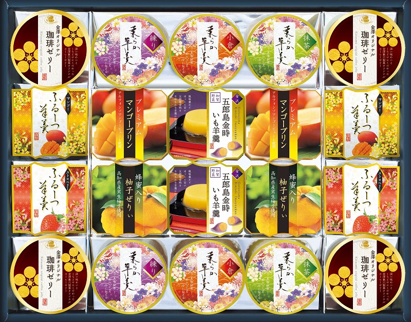 五郎島金時いも羊羹 80g×2個、プレミアムマンゴープリン 75g×2個、蜂蜜入り柚子ぜりぃ 75g×2個、金澤オリジナル珈琲ゼリー 52g×4個、柔らか羊羹抹茶 60g×2個、柔らか羊羹小倉 60g×2個、柔らか羊羹練り 60g×2個、ふるーつ羊羹ストロベリー 60g×2個、ふるーつ羊羹マンゴー 60g×2個