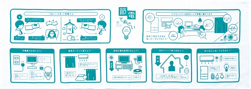 節電に関する役立つ情報がわかりやすく図説されたてぬぐい