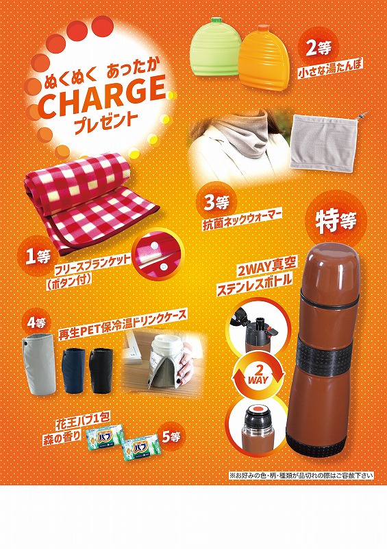 特等:2WAY真空ステンレスボトル×2コ・1等:フリースブランケット(ボタン付)×4コ・2等:小さな湯たんぽ×6コ・3等:抗菌ネックウォーマー×12コ・4等:再生PET保冷温ドリンクケース×16コ・5等:花王バブ1包 森の香り×60コ/A3ポスター/抽選箱/くじ100枚/くじ明細書/店頭用お知らせPOP2枚
