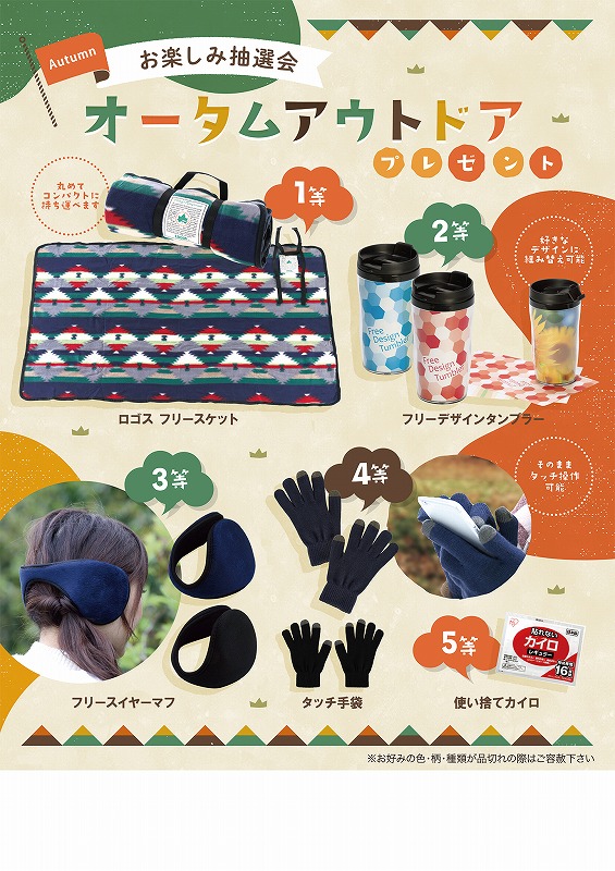 秋のアウトドアアイテムがもらえる抽選会、30人用